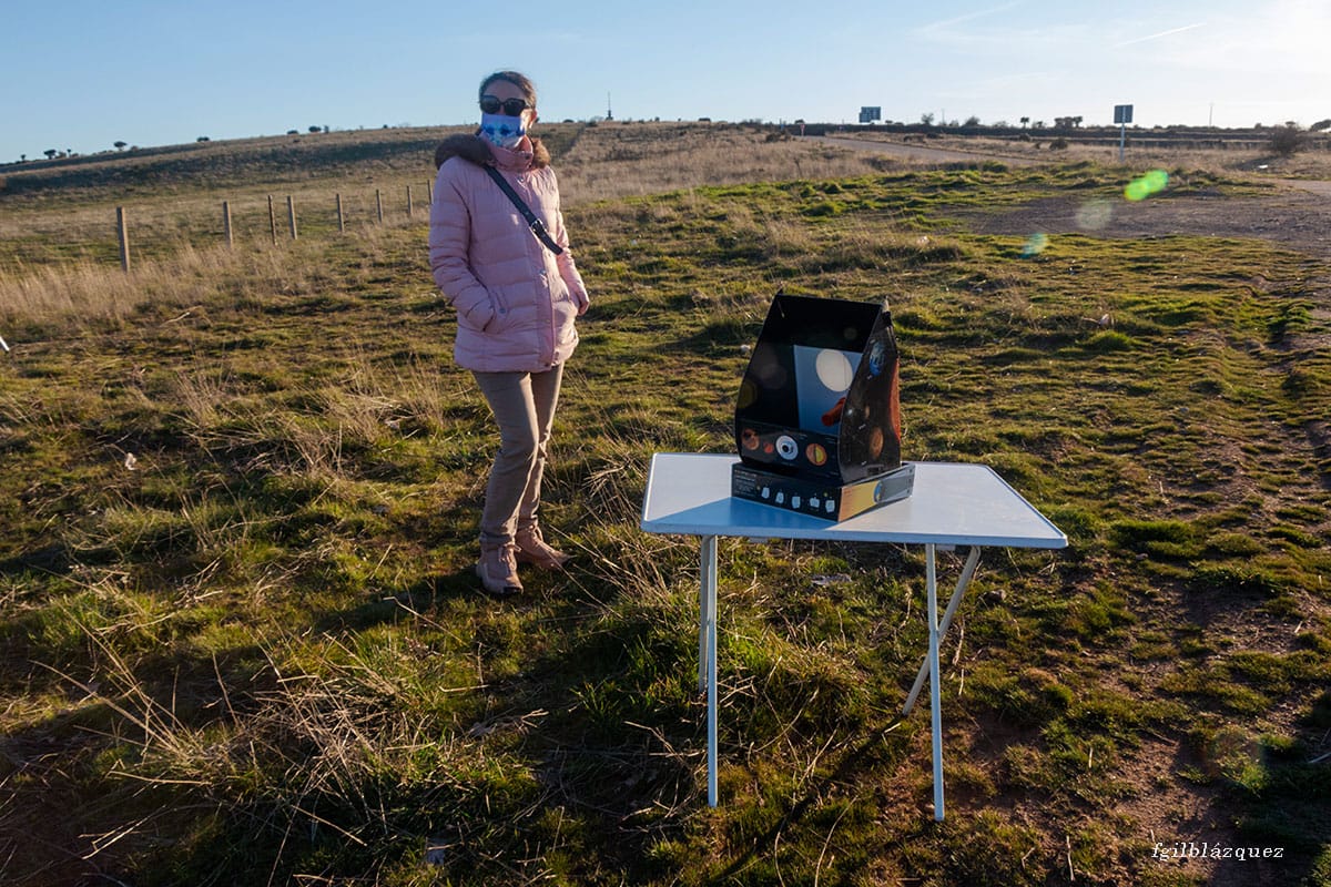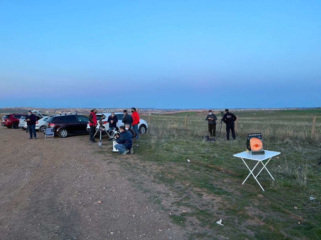 Sobre las 17 de la tarde llegamos al sitio de observación, que hoy estaba situado al lado de la feria monográfica. Comenzamos a montar los equipos.Después estuvimos observando el Sol con varios telescopios, el Solarscope, un Maksutov y en H-Alpha con el Lunt de la asociación.