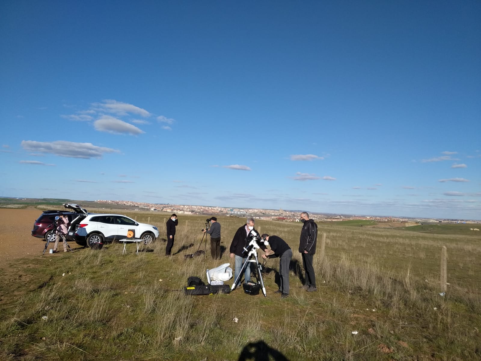 Aprovechando antes de que el sol descendiera más, lo que complicaría la calidad de la observación, lo primero que hicimos fué la observación en luz blanca con los telescopios de: Eliseo con su Maksutov-Cassegrein Celestrón NexStar127SLT y Pachi con un refractor Sky-Watcher, ambos con lámina solar; y el telescopio de O.S.A.E. Lunt LS50FHa con filtro de bloqueo B600 para H-Alpha.
