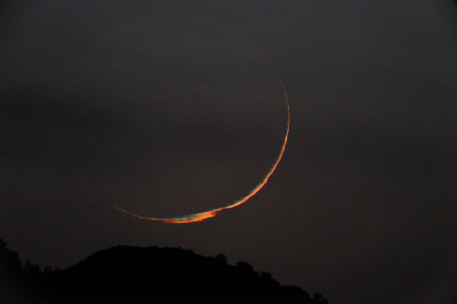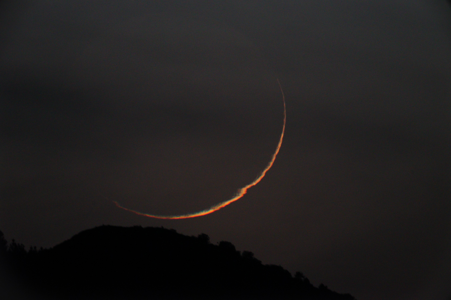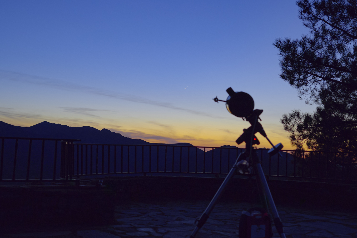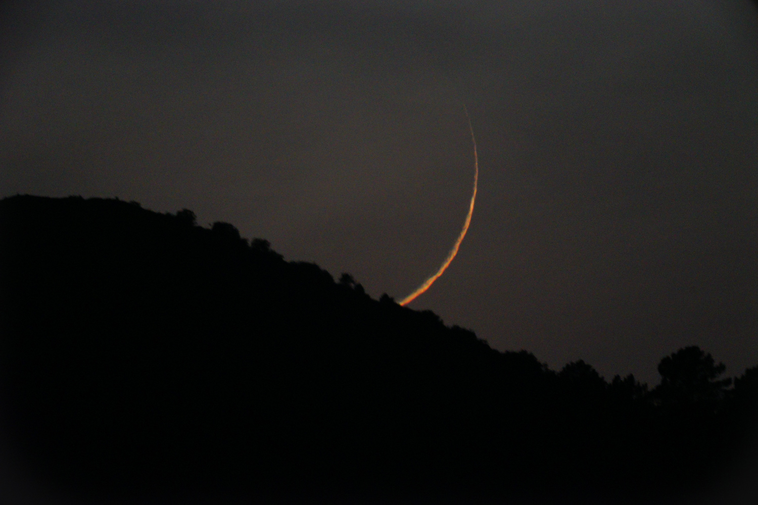 El relato de Óscar: Aunque yo no pude estar en esta ocasión con OSAE, si que estuve observando la Luna Neomenia desde Las Hurdes. Al principio me costó localizarla. Lo intenté con el Sol sobre el horizonte pero no fui capaz, yo creo que porque había muchos cirros y no conseguía ver la Luna a través de ellos. Después seguí intentándolo unos minutos después de que ese ocultara el Sol, pero tampoco y finalmente, sobre las 19:34 la localicé! bastante más alta de lo que me pensaba! Al principio se veía regular, porque aun había mucha luz en el cielo del crepúsculo, pero a medida que pasaban los minutos, se iba viendo cada vez mejor. Incluso a los pocos minutos, ya se podía ver bastante bien a simple vista. A las 19:44, a penas 10 minutos después de localizarla, llamé al grupo de OSAE que estaban en Salamanca para informarles y ver si la estaban observando, y en seguida la localizaron. Yo seguí observando y fotografiando la Luna hasta que se ocultó por el horizonte montañoso del lugar.