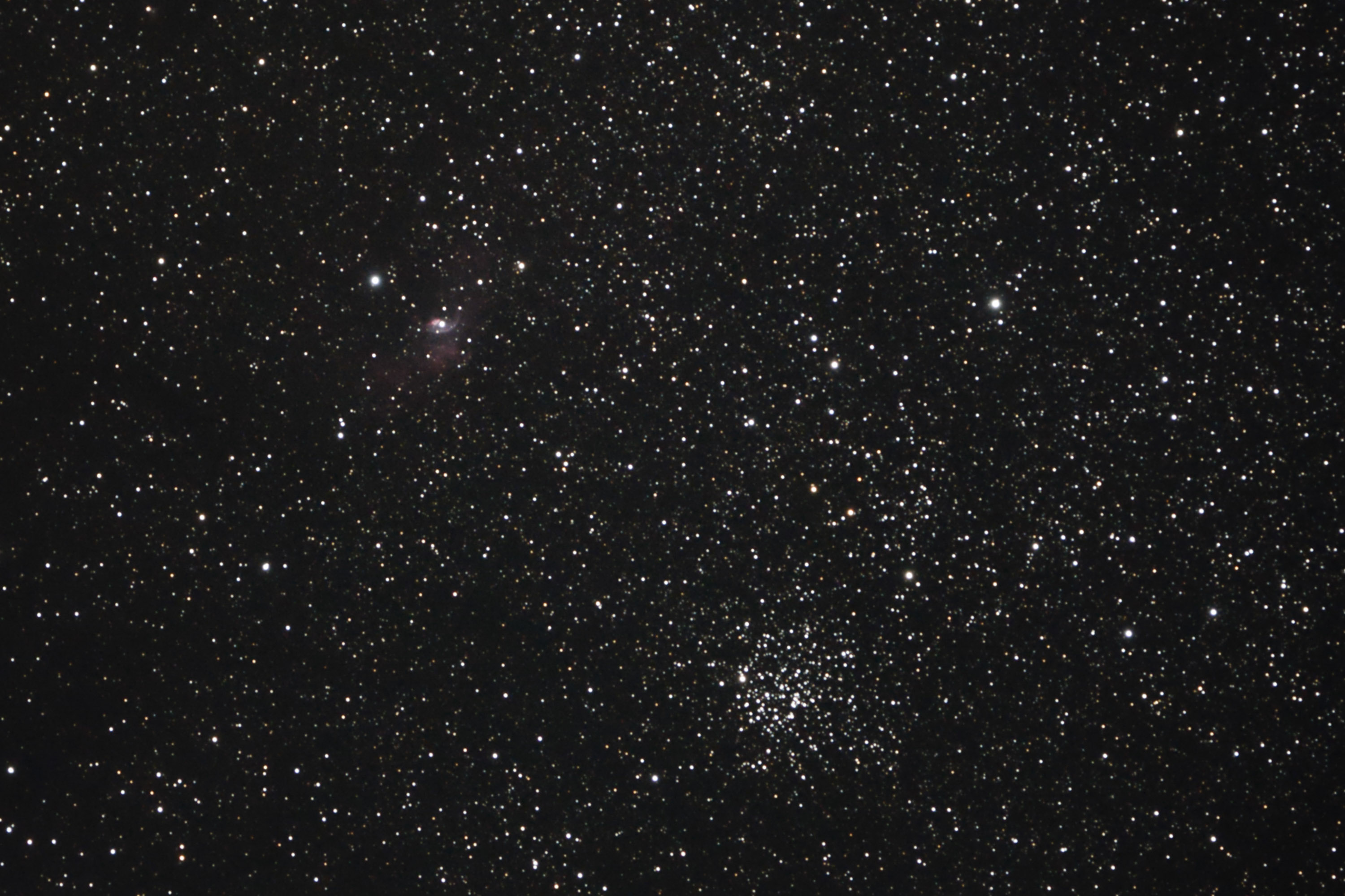 Aproveche también para ver la estrella dobleIzar, y algunas estrellas dobles más, aunque resolví Izar y la doble doble de Lira, es cierto que costaba desdoblar estas dos últimas. Cuando la zona de M52 levantó un poco por encima de los obstáculos, pude apuntar a ella para ver el cúmulo abierto y me puse a distinguir la nova Cas 2021. No tardé en localizarla con ayuda de los mapas. Se ve bastante brillante con una magnitud visual aproximada de +8. Lo mas curioso es saber que hace unos meses, esa estrella no era visible y ahora está accesible con unos prismáticos. También observé la nebulosa M27, la nebulosa planetaria NGC 6826 (Blinking planetary)