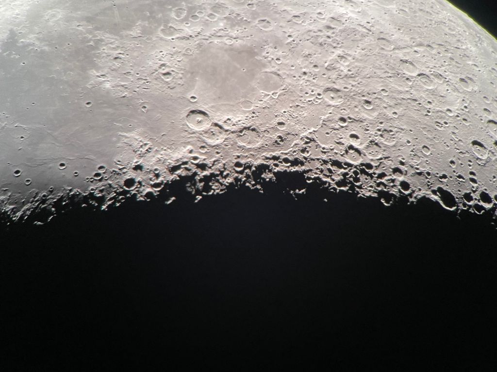 Después del estrés de la caza de la ISS, nos relajamos viendo los resultados en la pantalla del ordenador. Una vez comprobado todo, echamos un vistazo a la Luna con el Dobson de 12". Cuando estábamos con la observación llegó Charo que se unió a nosotros. Lo primero que hicimos fue observar el planetaMercurio. Se veía como una diminuta luna creciente, donde pudimos apreciar bastante bien la fase del planeta. También vimos un vistazo fugaz al planeta Venus, pero estaba ya muy bajo y su luz deslumbraba. Pablo y Vanessa se marcharon y nos quedamos Charo y yo siguiendo con la observación. Nos deleitamos un buen rato observando la Luna con diferentes aumentos, e incluso pudimos ver la ocultación de 2 estrellas de magnitud +8 y +9.5 por la parte oscura de la Luna, en un intervalo de pocos segundos sobre las 22:39. Como toda ocultación por la Luna fue rápida y bonita.