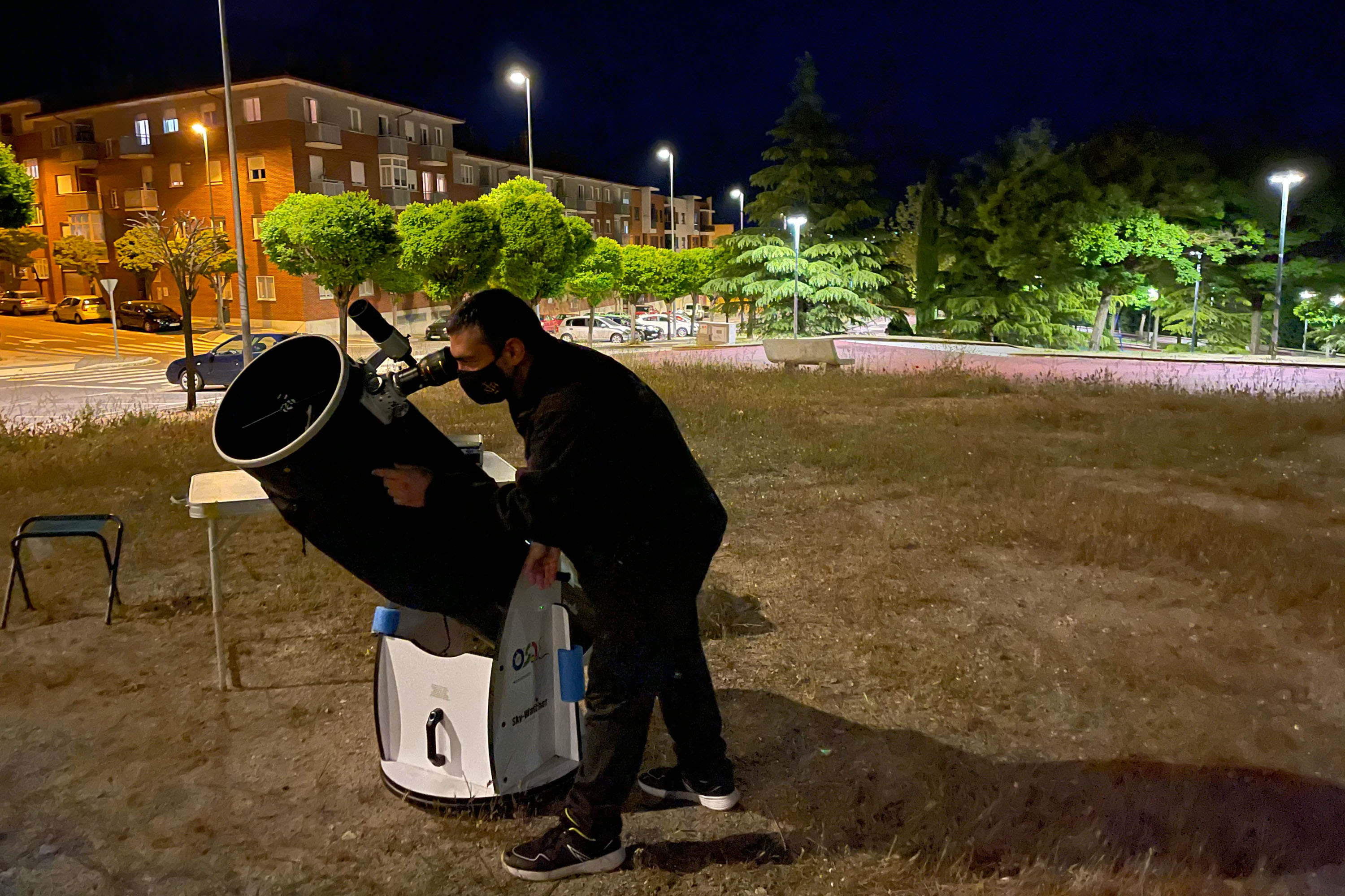 En principio ahí terminaba la observación, pero sobre las 21:30 vi que pasaría la ISS y le pregunté a Pablo si se animaba a intentar fotografiarla. Así que tras una deliberación exprés, decidimos salir a intentarlo. Puse un breve aviso en el grupo de OSAE por si alquilen que se quería venir y solo respondió Charo.