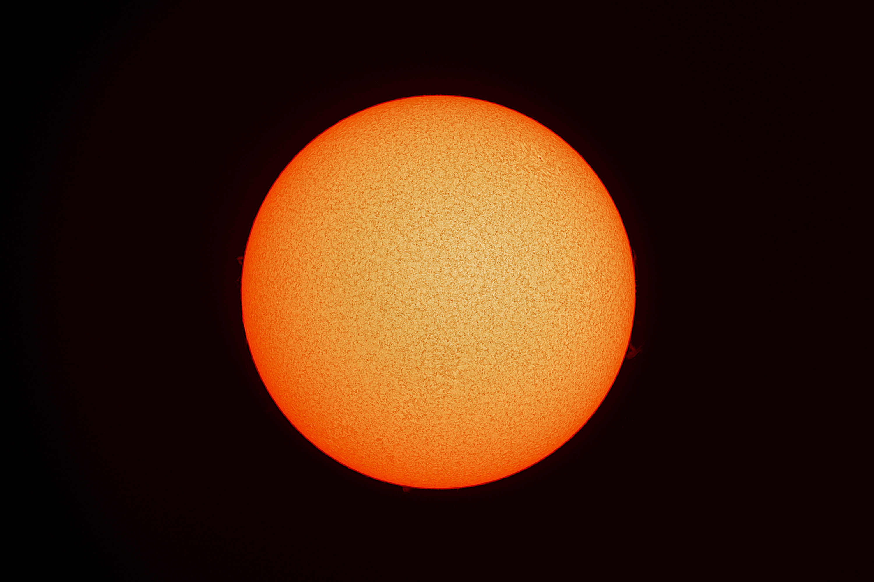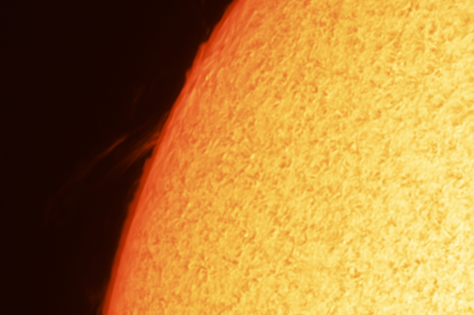 Disco solar en H-Alpha con el gamma alto, para obtener una imagen del la cromosfera y de las protuberancias.. |