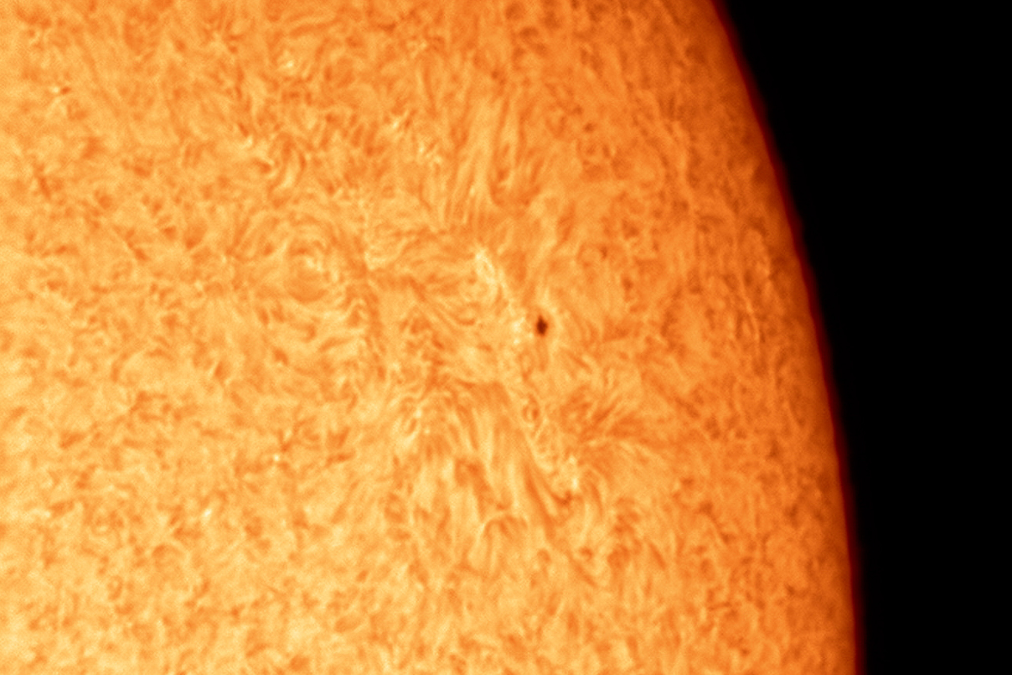 Disco solar en H-Alpha con el gamma bajo, para obtener mayor contraste. |