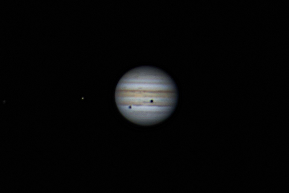 Nada mas apuntar a Júpiter vimos que ya tenía visible una de las sobras sobre el planeta, concretamente la de Calisto. Era bastante pequeña y algo difuminada, pero se diferenciaba perfectamente. Aunque no vimos Genímedes transitando por el planeta, si que lo vimos en cuanto asomó por el borde, dejando una bonita imagen del satélite pegadito al planeta. casi podíamos ver a tiempo real como se iba moviendo y alejándose. A los pocos minutos, también vimos aparecer la sombra de Ganímedes como un pequeño mordisco en el planeta, que rápidamente iba avanzando y finalmente dejó verse como un disco negro muy bien definido y mas grande que la sombra de Calisto. Las dos sombras fueron avanzando lentamente por el disco de Júpiter y notamos como la de Ganímedes avanzaba más rápido que la de Calisto, debido a la posición de los dos satélites y a su movimiento. Disfrutamos mucho de Júpiter durante toda la noche, aunque también aprovechamos para deleitarnos con saturno y sus anillos.