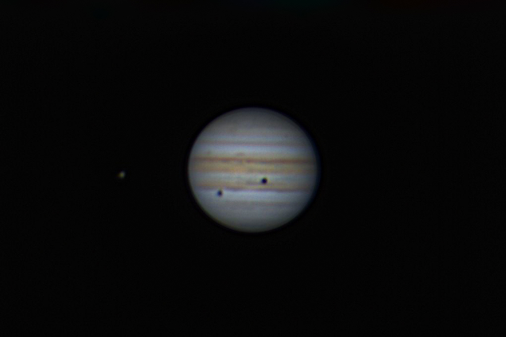 Júpiter con los satélites Calisto y Ganímedes y sus sombras proyectadas sobre el planeta. Camara ASI 120MC + Celestron 8"