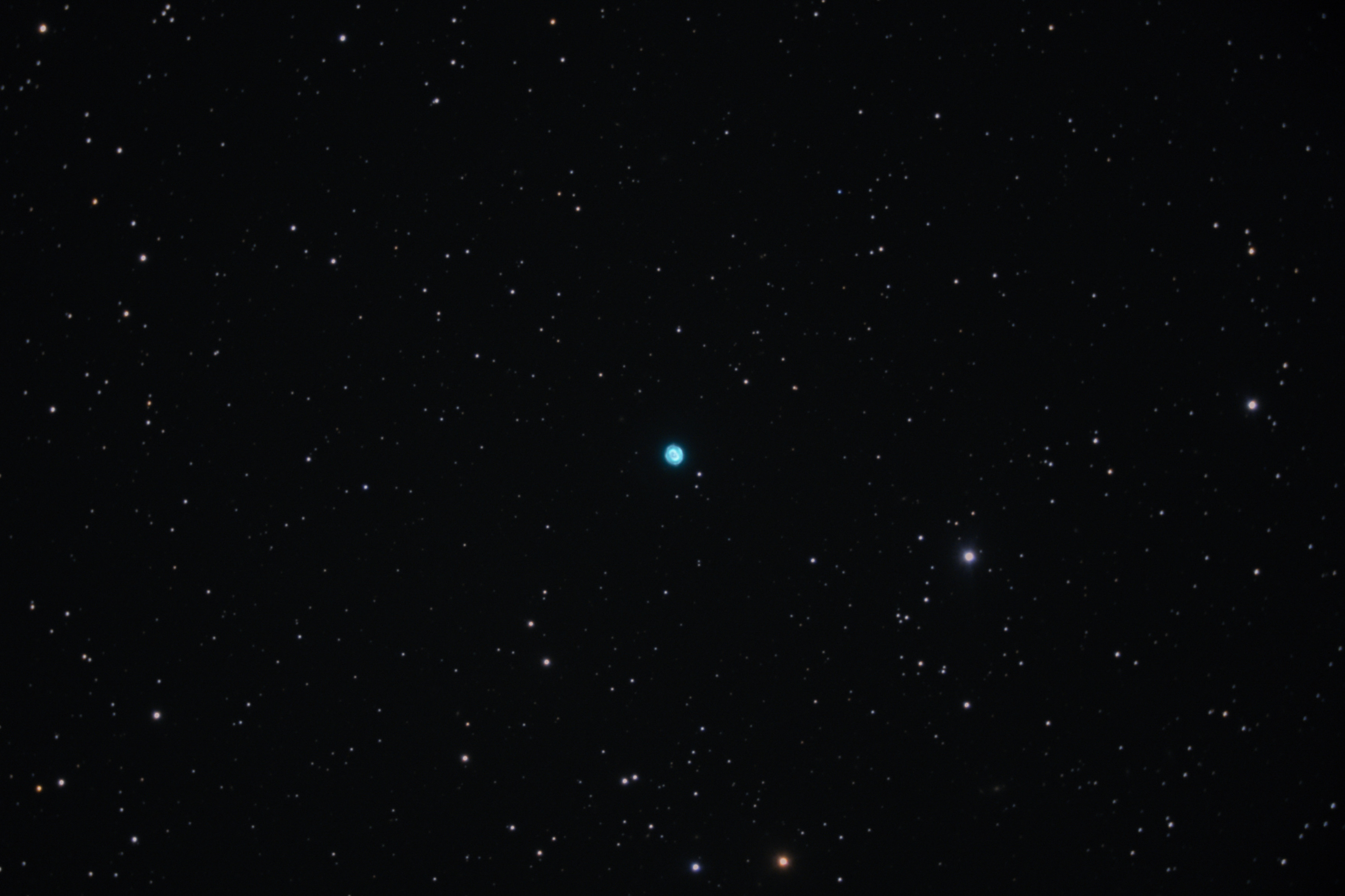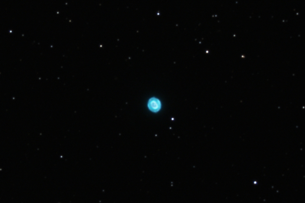 Tiré a NGC891 pero salía muy movido, pese a realizar bien el guiado. Después pase a la nebulosa planetaria, bola de nieve azul con tomas mas cortas, pero enseguida se empañó. Menos mal que me dio tiempo para hacer unas cuantas tomas y poder apilar. Y al final ha salido un resultado bueno. De hecho, diría que la mejor foto que he sacado de esta nebulosa.