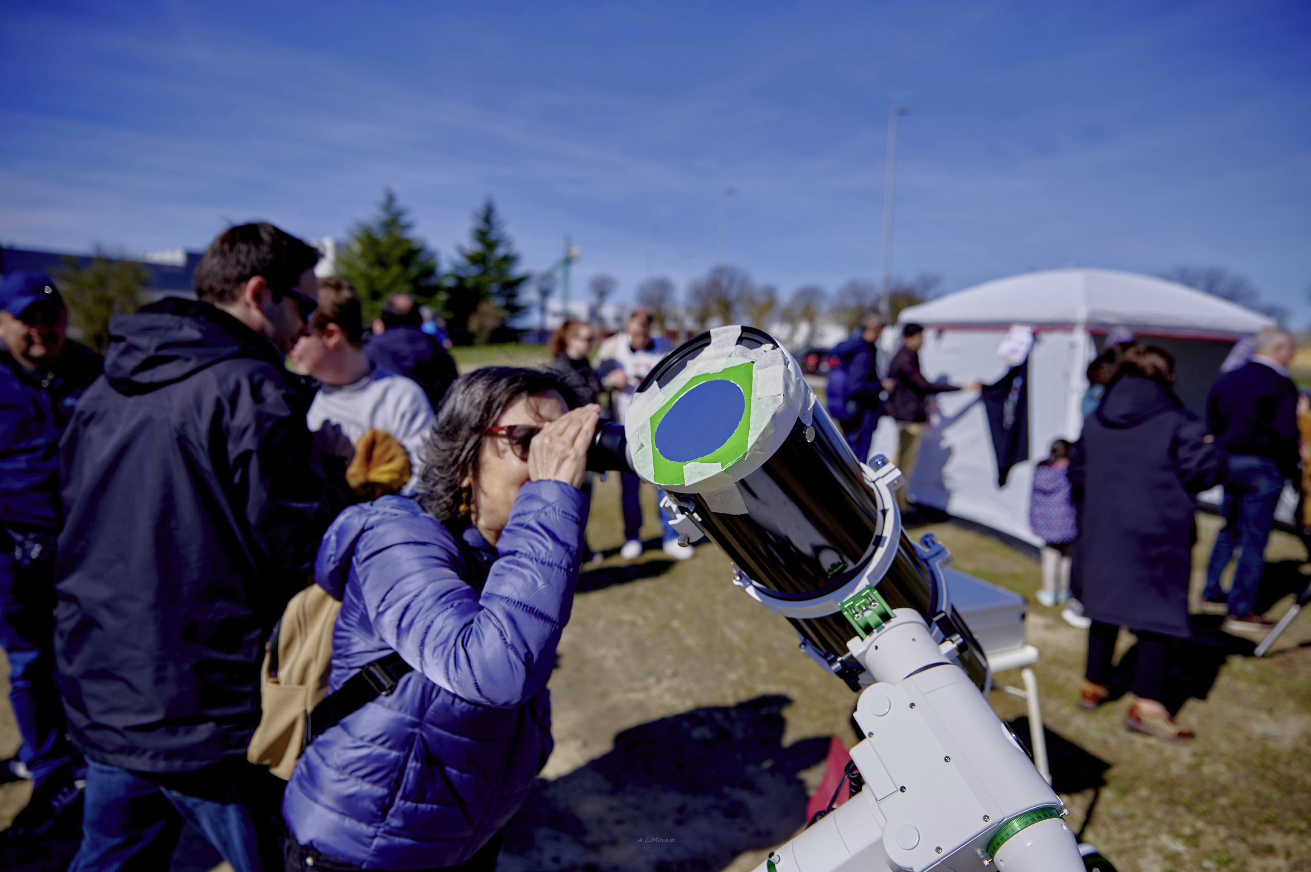 Una cosa que gustó bastante a la gente fue el efecto pinhole. Tanto Miguel Ángel con una espumadera, como Germán con una cartulina con tres agujeros de formas distintas, un triángulo, un cuadrado y un círculo, mostraron al público cómo observar el eclipse a través de dicho experimento. También se les enseñaron otros métodos de observación por proyección, como por ejemplo, entrelazando los dedos, con el pelo de las personas que lo tuvieran largo o incluso con las sombras de las hojas de los árboles. Otro experimento que realizó Miguel Ángel fue simular un eclipse con un modelo a escala del sistema Tierra-Luna. A las 11.39 la Luna cubrió el 24,3% del disco solar alcanzando así el máximo de este evento en nuestra localización. Algunas personas intentaron inmortalizar el momento con sus móviles y algunas de ellas consiguieron resultados bastante aceptables. Durante la fase en la que el porcentaje de cobertura del Sol descendía, la gente siguió pasando por nuestros telescopios y binoculares y usando las gafas de eclipse que muchos de ellos habían adquirido en un kiosco cercano, además de algunas que nosotros íbamos prestando para poder ver el eclipse mientras esperaban la cola. A lo largo del eclipse además varios socios fuimos entrevistados por la prensa local. Finalmente, el eclipse terminó sobre las 12.35 y empezamos la recogida de equipos y la carpa para dejar el lugar de observación impoluto.