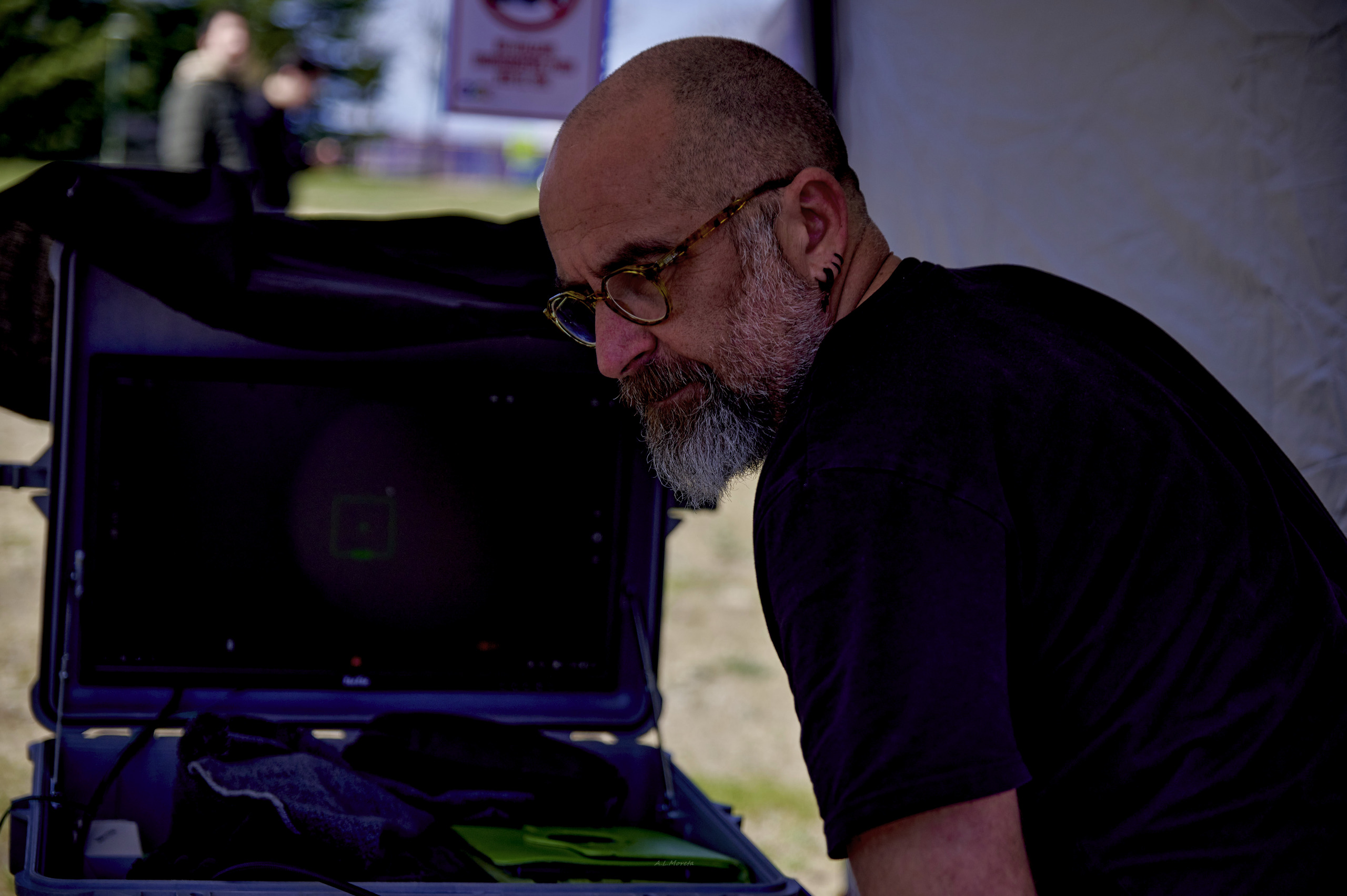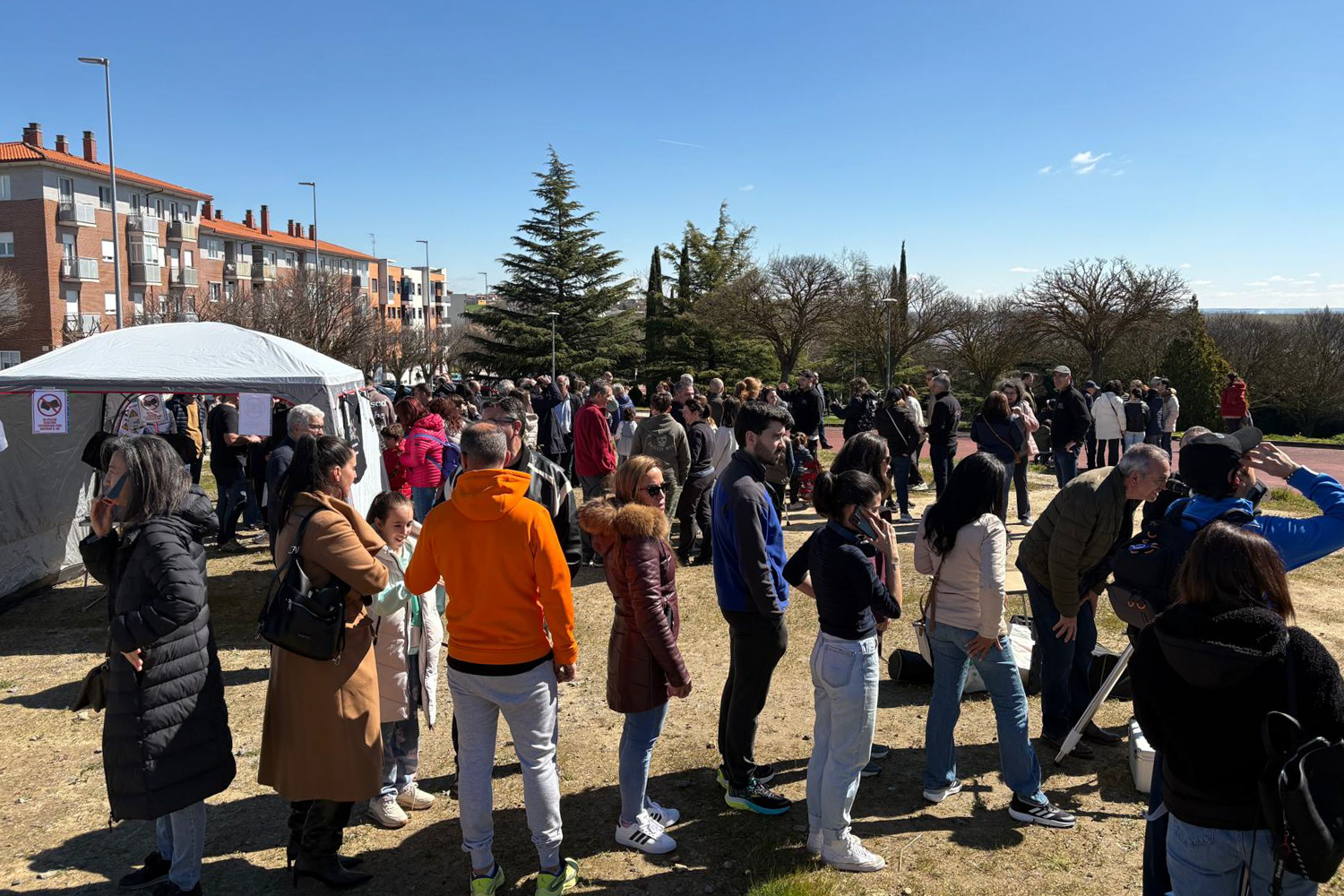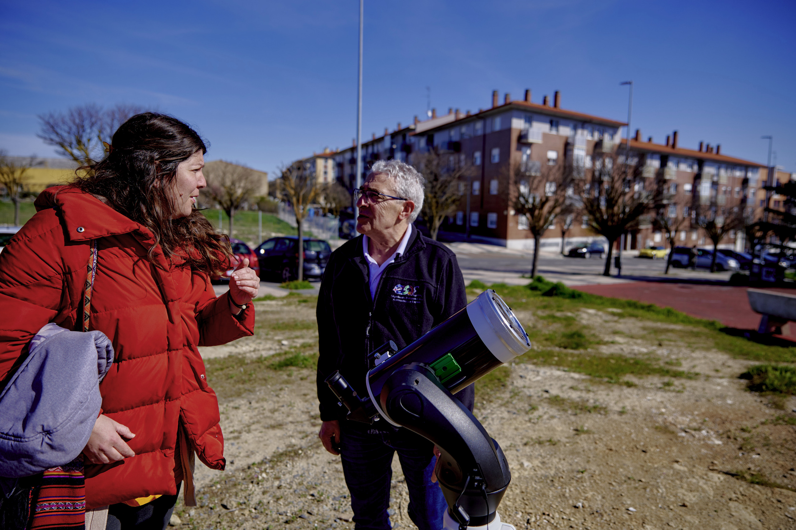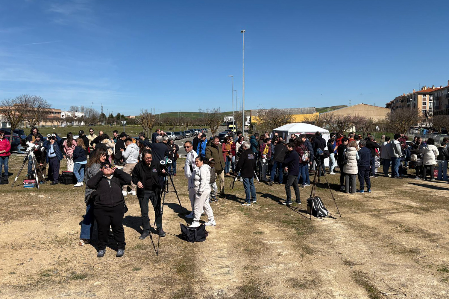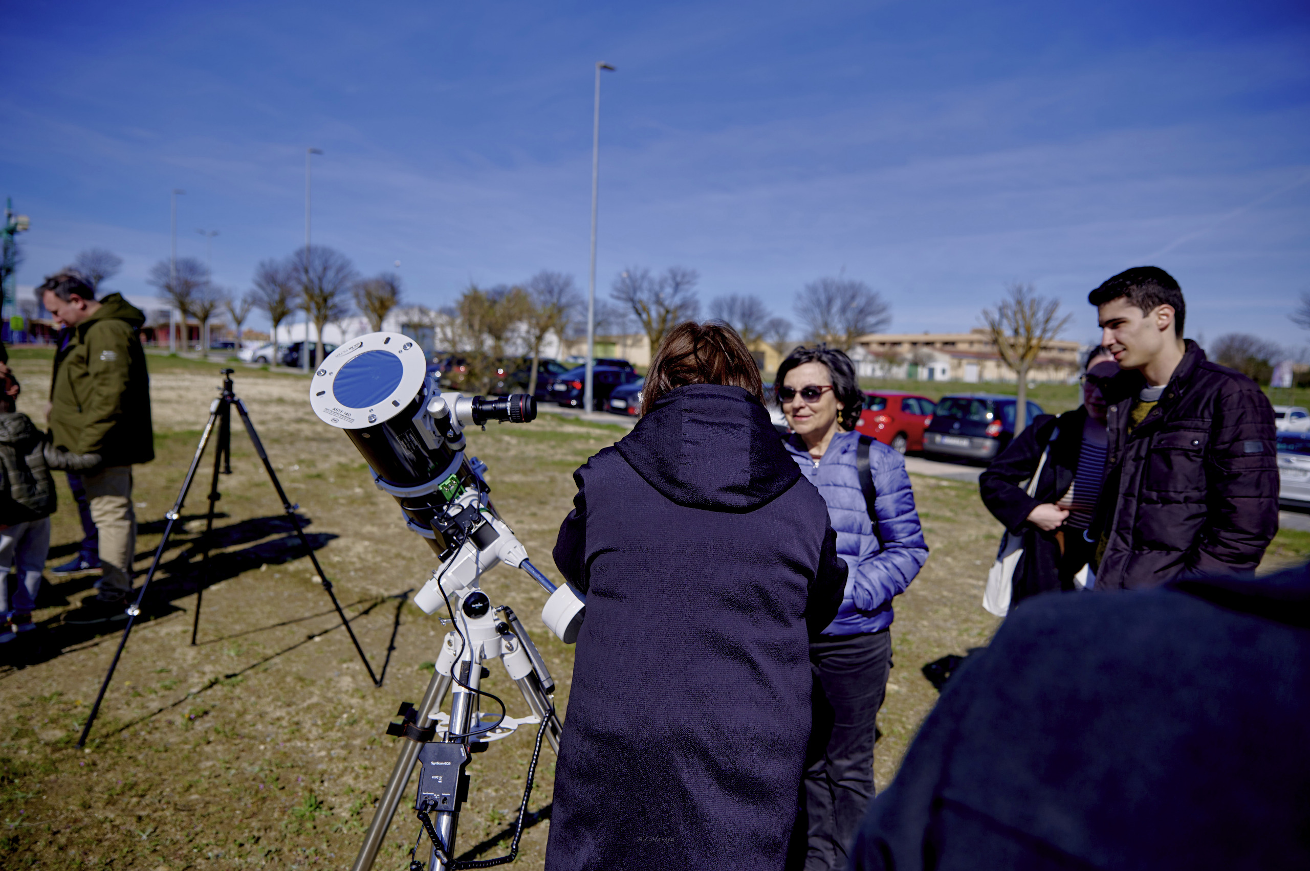 Sobre las 9 de la mañana llegaron los primeros socios al lugar de la observación. Poco a poco fuimos llegando los demás entre las 9 y las 9:30. Sobre las 9:40 un coche patrulla de la policía local se acercó para ver si necesitábamos algo. Sobre esa hora también fueron llegando miembros de la prensa. Mientras los socios con equipo íbamos montando, otros socios empezaron a montar la carpa y el monitor donde se proyectarían imágenes del Sol. Durante ese tiempo la prensa hizo fotos del proceso de montaje.